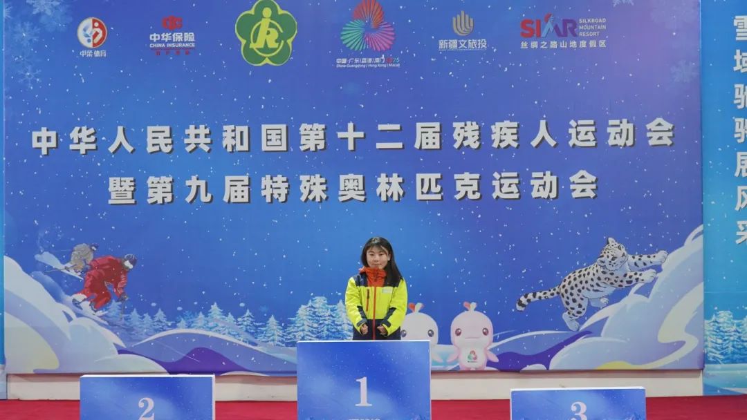 图为女子矮小组别大回转项目颁奖现场,我市运动员马吉花获得该项目金牌