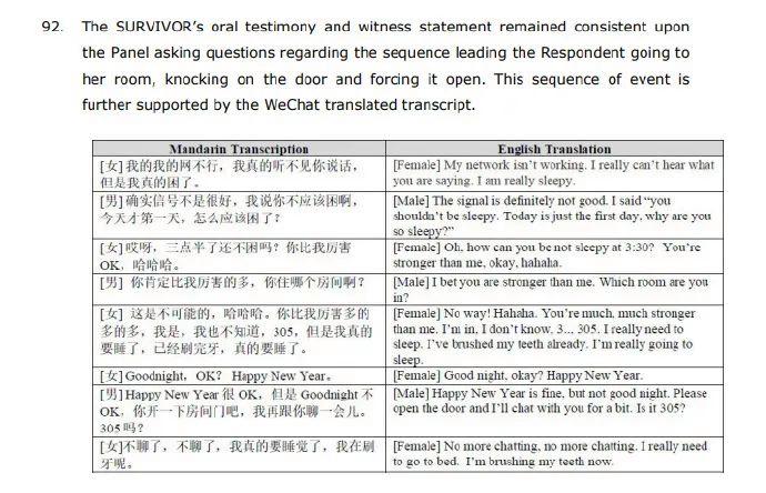 国际乒联的调查基于受害者的陈述以及双方的聊天记录。聊天记录显示,徐克主动询问受害者的房间号,并在对方表示要睡觉的情况下,仍然坚持进入房间“再聊一会儿”。此外,裁决提到,徐克的行为严重违反了国际乒联的反骚扰政策,且调查过程中未发现徐克提供的有效证据来反驳指控。