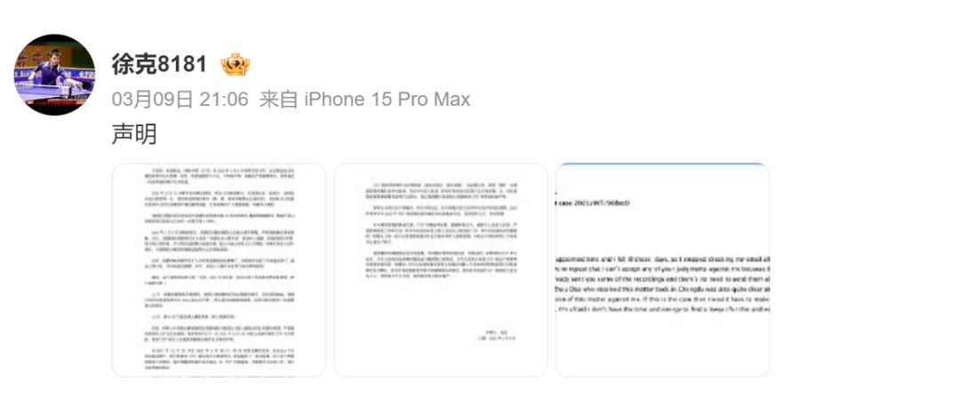 3月6日,国际乒联(ITTF)在发布的裁决文件中,明确指控教练兼前运动员徐克违反了国际乒联的反骚扰政策,并对其处以禁赛10年的处罚。