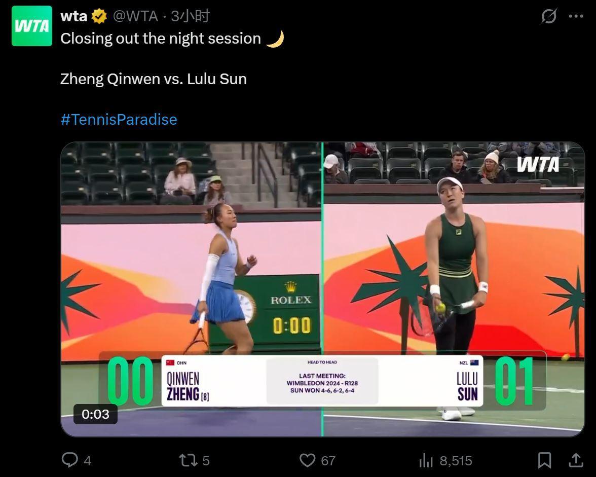 北京时间3月10日下午,中国“金花”郑钦文在本年度首个男女合赛的职业网球1000级别赛事——印第安维尔斯1000赛中2:0力克新西兰球员孙璐璐,首次挺进本项赛事的女单16强。