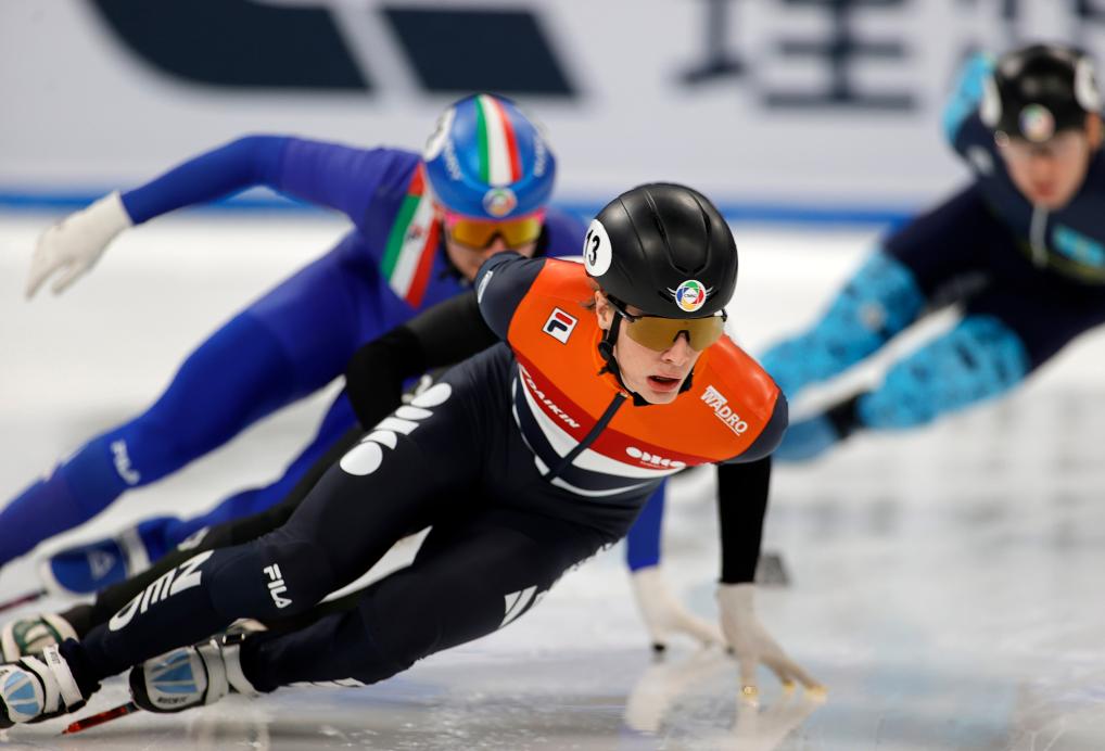 3月14日,在北京举行的2025年短道速滑世锦赛混合团体接力四分之一决赛中,荷兰队以2分35秒339的成绩打破世界纪录。图为荷兰队选手延斯·范特·沃特在比赛中。新华社记者丁旭摄