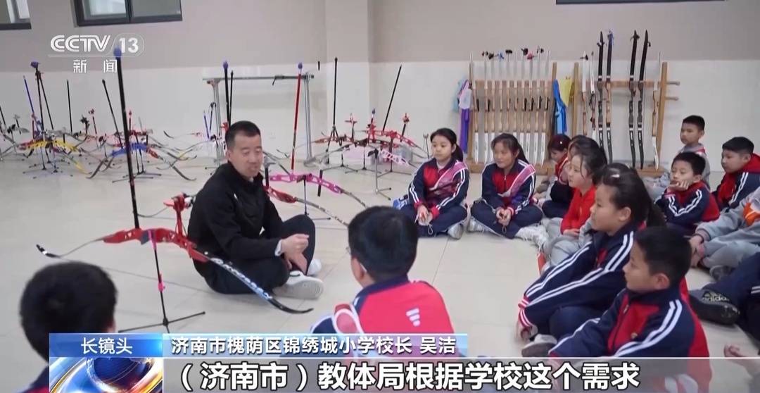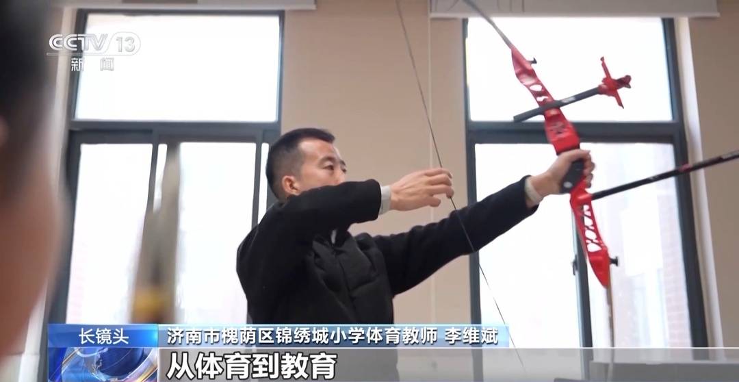 这位正在教孩子们射箭的体育教师,叫李维斌,全国射箭室外锦标赛冠军。退役两年后,通过面向射箭项目的专项招聘,李维斌成了济南市一所小学的体育教师。