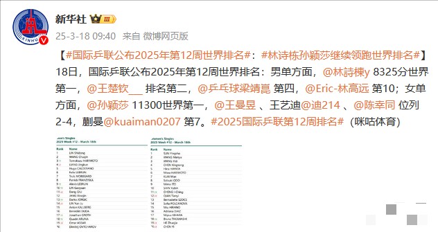 国际乒联公布2025年第12周世界排名:林诗栋、孙颖莎继续领跑世界排名