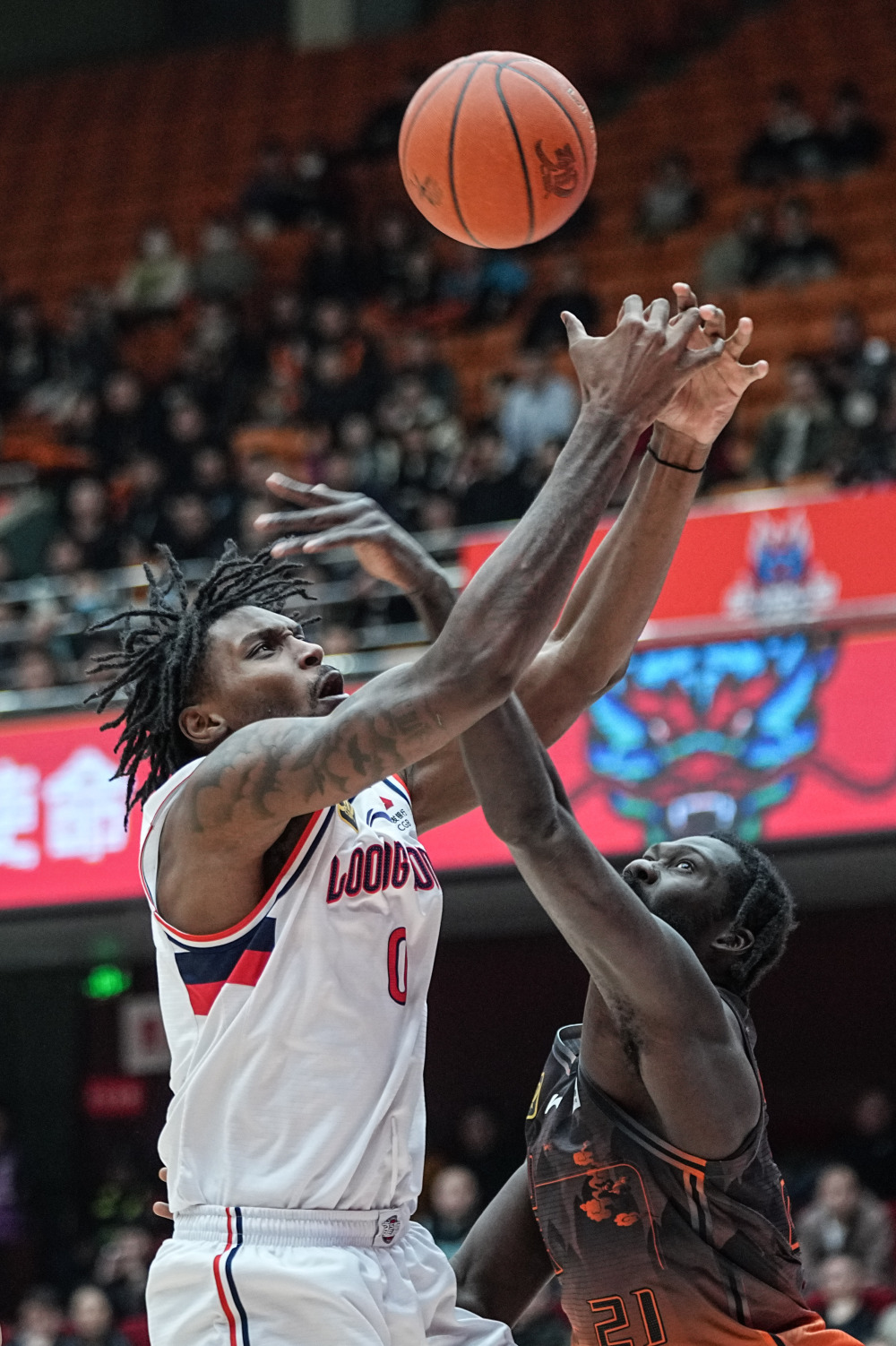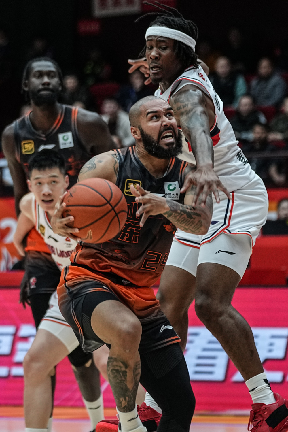 3月19日,广州朗肽海本队球员麦克韦恩(左)与山东高速队球员郭凯在比赛中争球。新华社记者 朱峥 摄