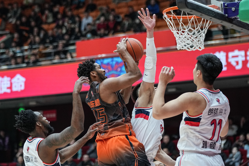 3月19日,山东高速队球员陶汉林(中)在比赛中进攻受阻。新华社记者 朱峥 摄
