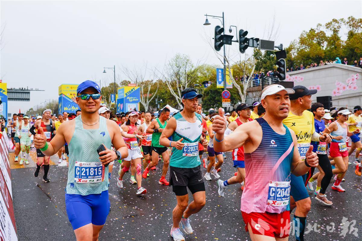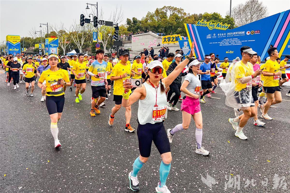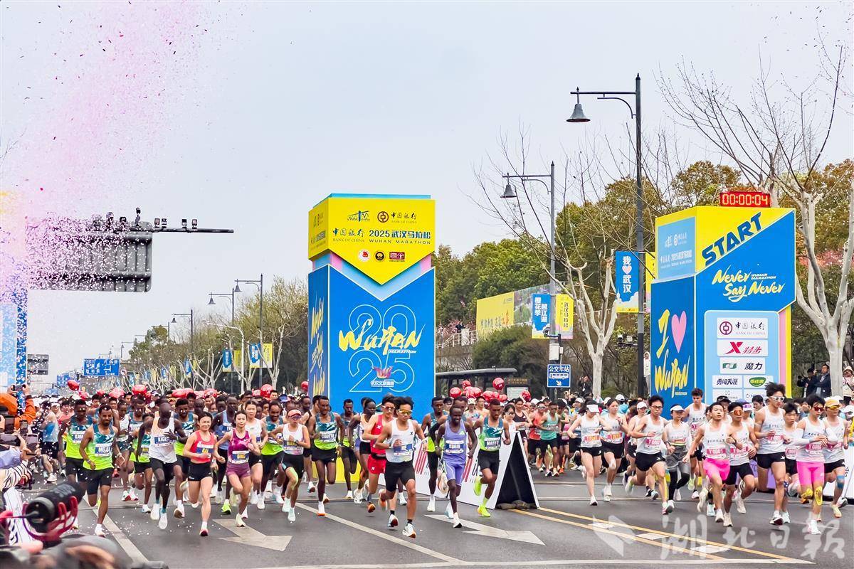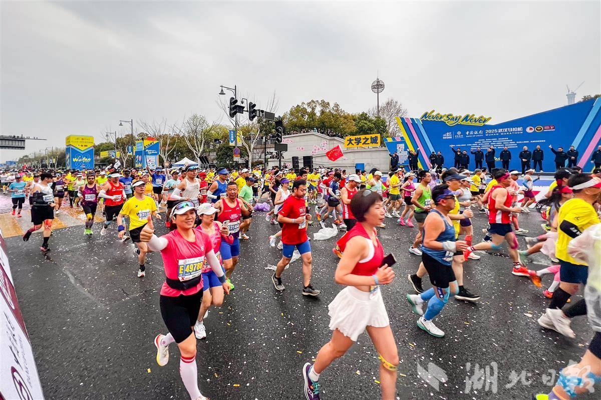 3月23日7时30分,2025武汉马拉松鸣枪开跑,4万名汉马健儿从汉口江滩三阳路出发,共赴江城春日盛宴。(湖北日报全媒记者倪娜摄)