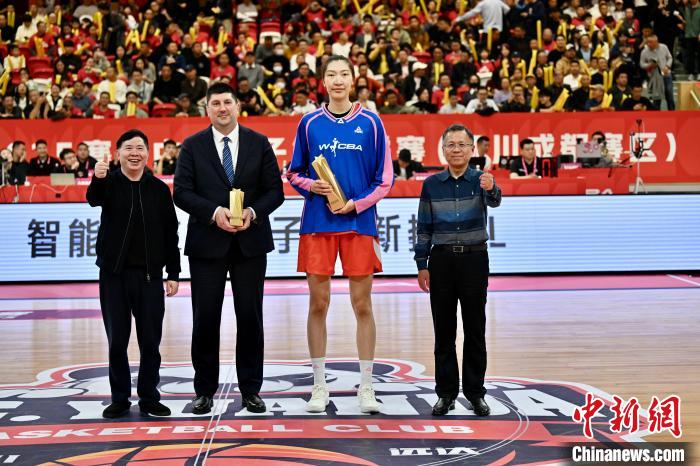 3月25日,2024-2025赛季中国女子篮球联赛(WCBA)常规赛最有价值球员(MVP)出炉,四川队中锋韩旭蝉联该奖项。图为韩旭(右2)在成都举行的颁奖仪式上捧起奖杯。 中新社记者张浪摄