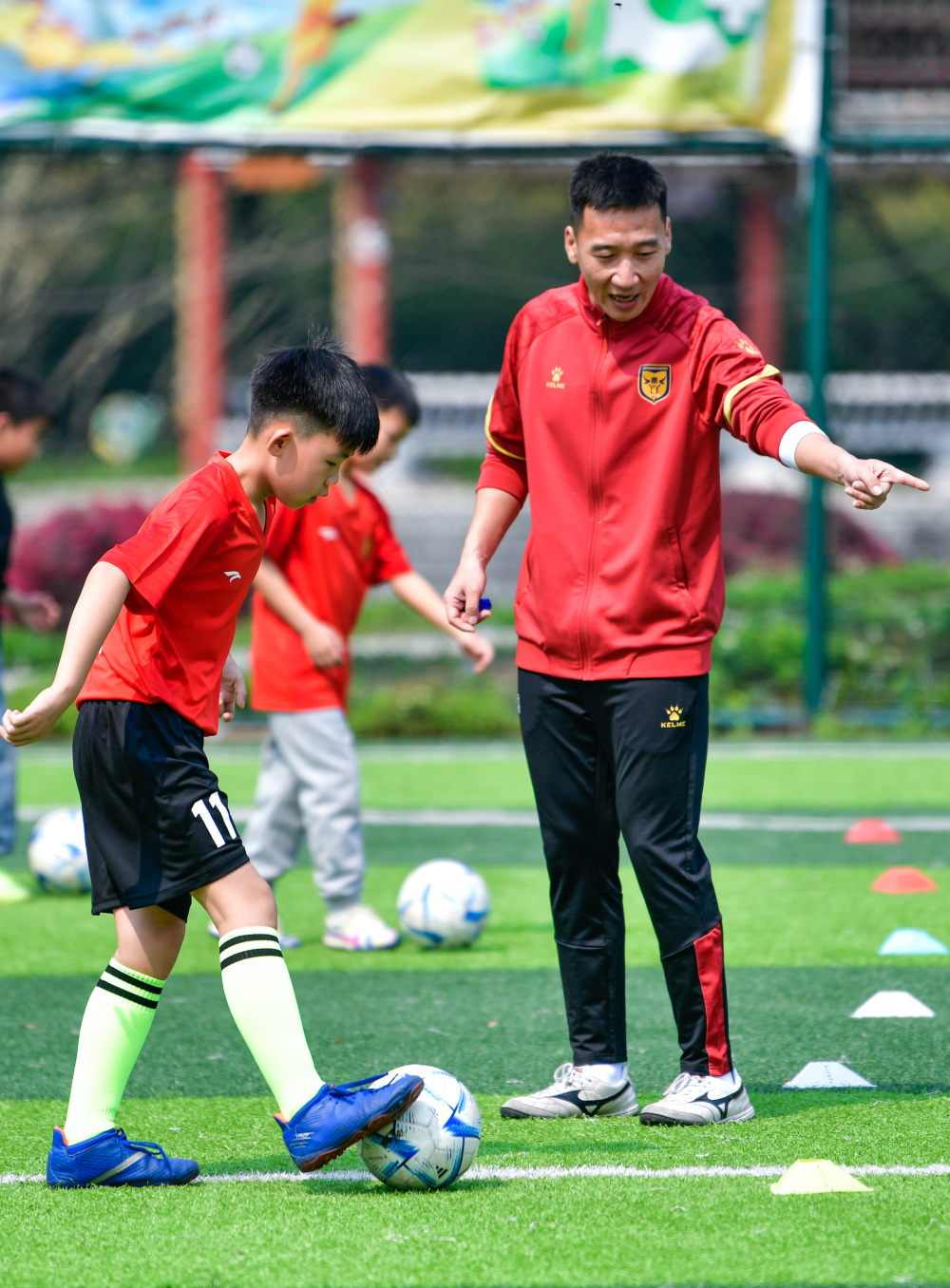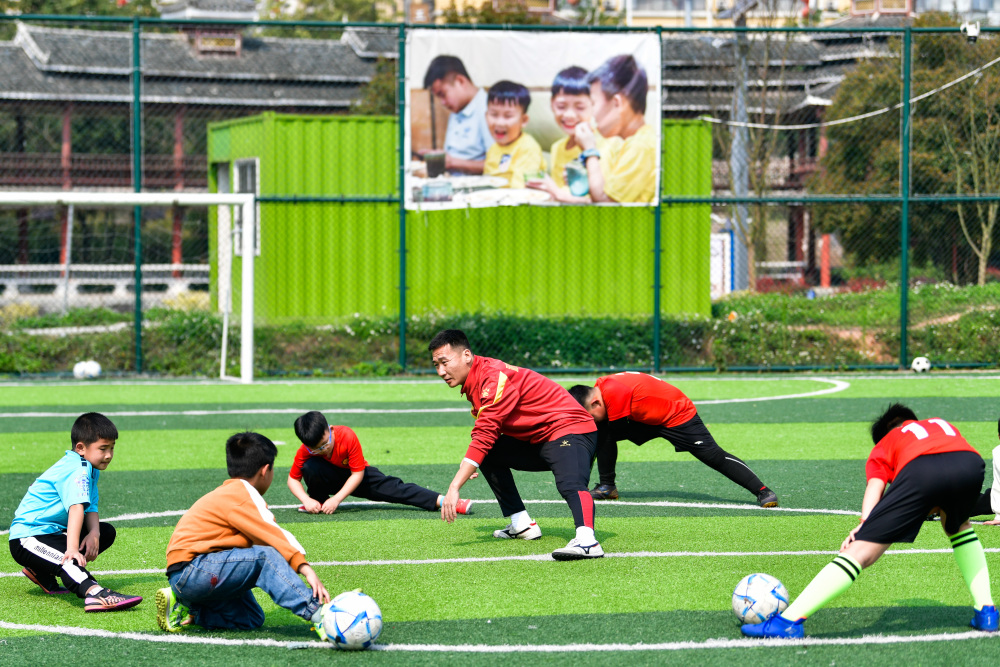 董永恒(右)为榕江县的孩子进行足球基本功培训(3月23日摄)。新华社记者 杨文斌 摄