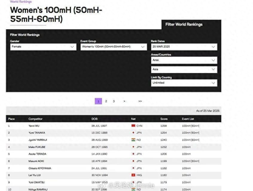3月27日,世界田联更新了最新一期女子田径项目世界积分,中国选手吴艳妮以1258分超越日本名将田中佑美,首次登顶亚洲第一。
