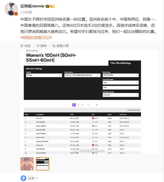 登顶之后,吴艳妮在个人社媒发文回应:中国女子跨栏夺回亚洲排名第一的位置。亚洲排名前十中,中国有两位,我第一,中国香港的吕丽瑶第八。还有6位日本选手2位印度选手。孤独作战其实很难,但我只想说困难越大越有动力。希望对手们都放马过来,我们一起比出精彩的比赛。