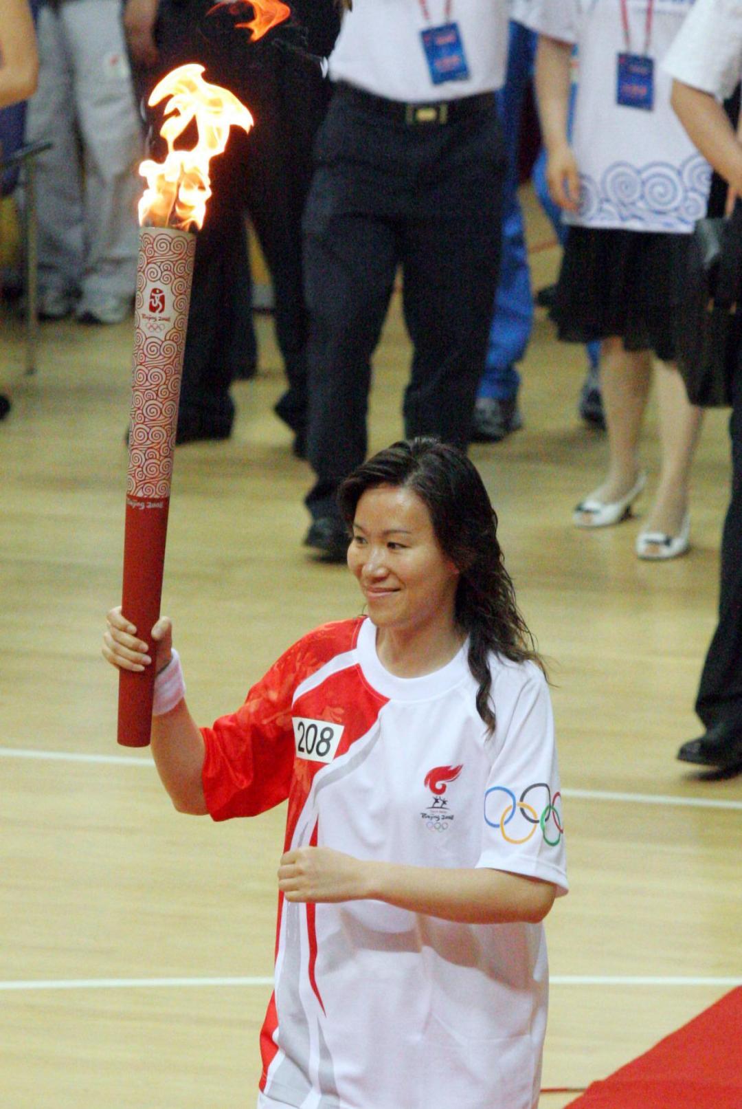(2008年5月25日,北京奥运会圣火在江苏南通传递,最后一棒火炬手、羽毛球奥运冠军葛菲传递火炬。)