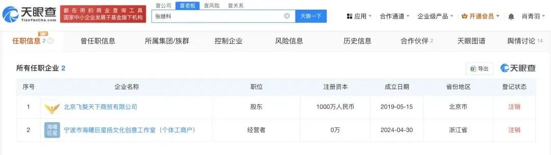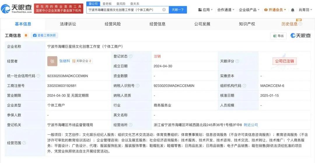 天眼查App显示,张继科名下目前关联2家企业,均为注销状态。其中,宁波市海曙巨星扬文化创意工作室(个体工商户)成立于2024年4月,经营者为张继科,经营范围包括文化娱乐经纪人服务、体育竞赛组织、教育咨询服务等。