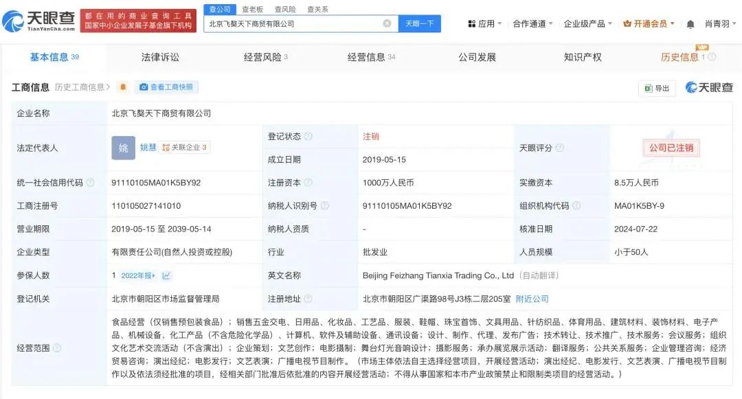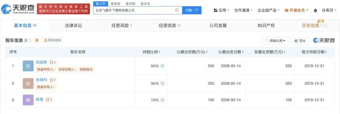 北京飞獒天下商贸有限公司成立于2019年5月,法定代表人为姚慧,注册资本1000万人民币,经营范围含食品经营、组织文化艺术交流活动、企业策划、文艺创作、电影摄制、演出经纪、电影发行、文艺表演等。股东信息显示,该公司由田国君、张继科、姚慧分别持股55%、35%、10%。