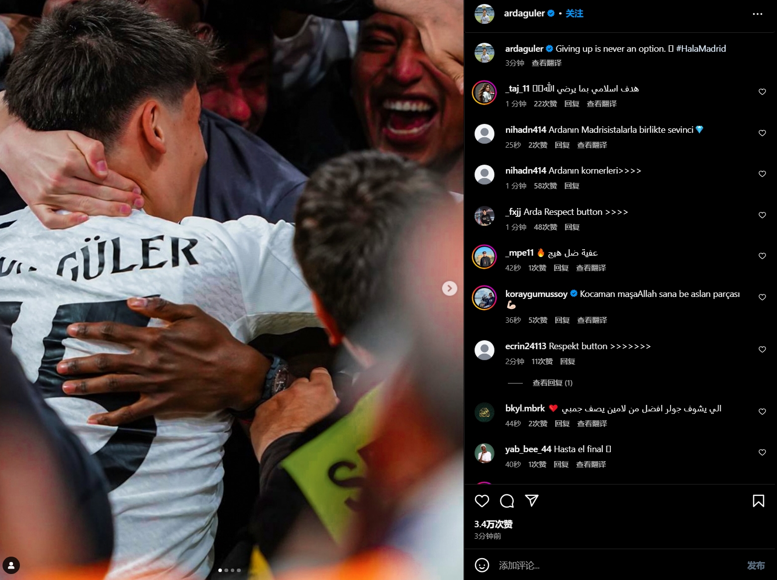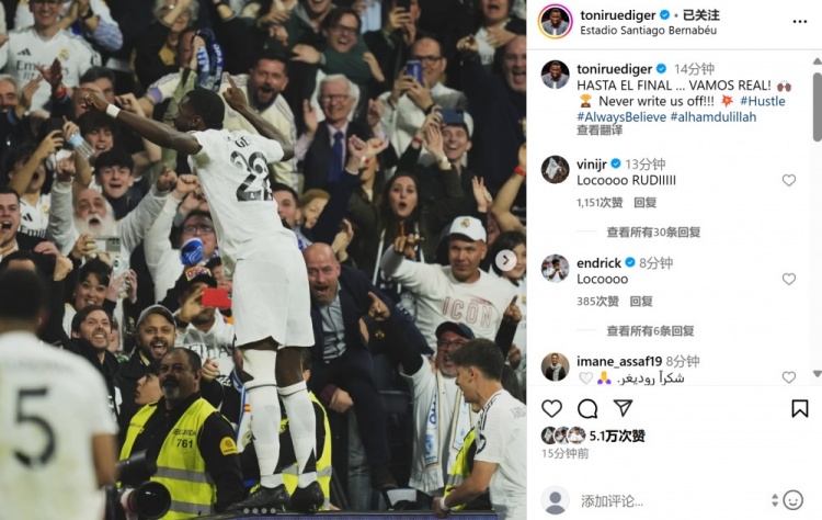 本场比赛吕迪格在加时赛中打进绝杀进球,赛后他也在个人社媒晒出疯狂庆祝进球的照片,配文写道:“直到最后!加油皇马,永远不要把我们排除在外!”