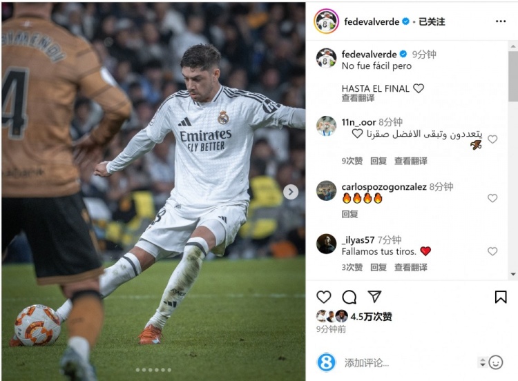 巴尔韦德社媒晒出自己的赛场照片,配文:“这并不容易,但……拼到最后!”