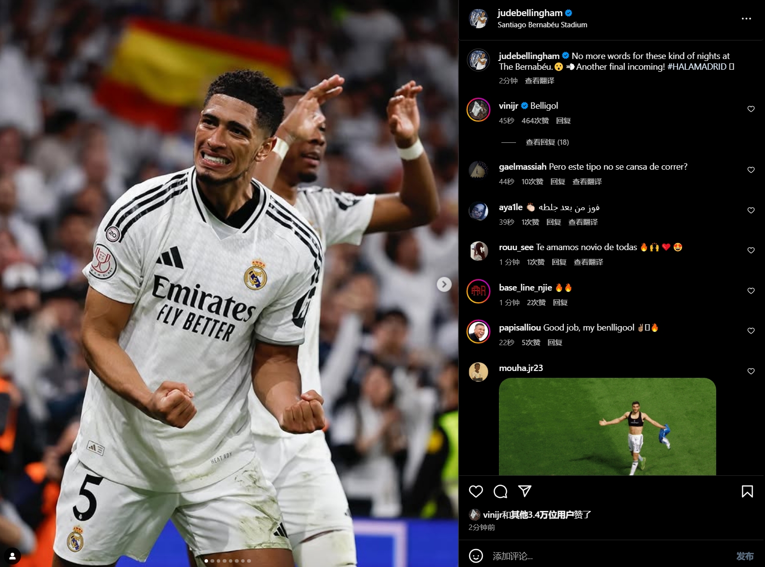 贝林厄姆社媒晒出庆祝胜利的照片,配文:“伯纳乌这样的夜晚没有更多言语形容,又一场决赛即将来临!”