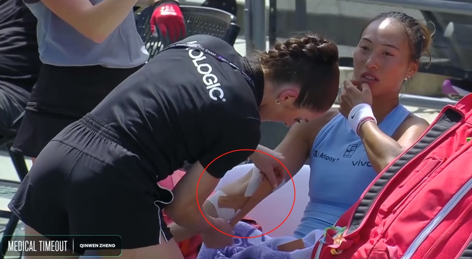 第2盘开局没多久,郑钦文申请了医疗暂停治疗肘部伤势,现场可见其肘部缠满绷带。近来,右手肘的伤势导致郑钦文一直戴着护具训练和参赛。