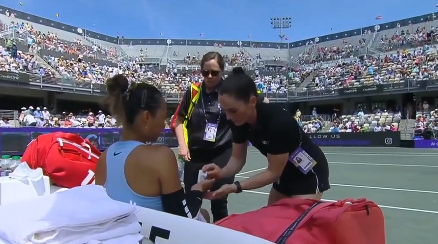比赛中,郑钦文受肘部伤势影响,一度申请医疗暂停,吃了止疼片后坚持完赛。