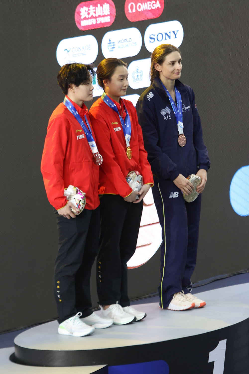 4月6日,冠军中国选手陈佳(中)、亚军中国选手陈艺文(左)、季军澳大利亚选手基尼在颁奖仪式上合影。新华社发(迪亚娜·马克斯摄)