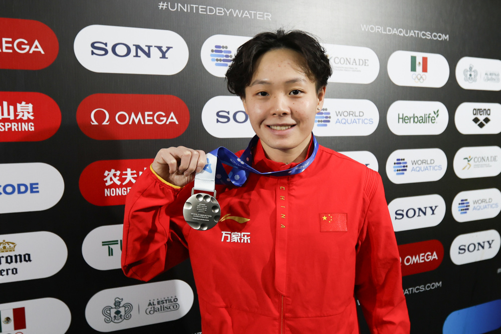 4月6日,亚军陈艺文在颁奖仪式后展示奖牌。新华社发(迪亚娜·马克斯摄)