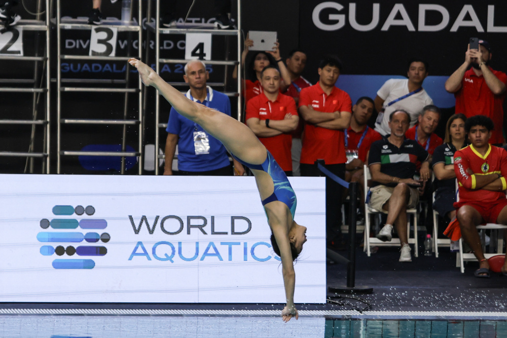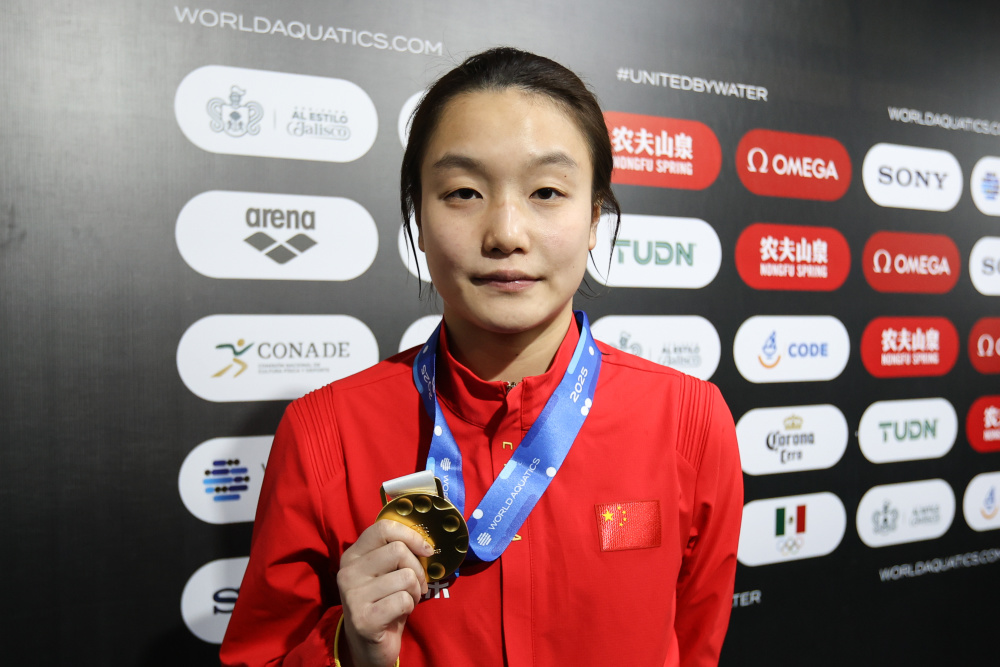 4月6日,冠军陈佳在颁奖仪式后展示奖牌。新华社发(迪亚娜·马克斯摄)