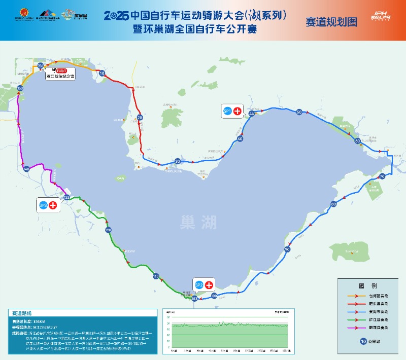 2025环巢湖赛道全程约156公里,将首次实现完整环巢湖一圈。赛道路线如一条灵动的丝带,贯穿肥东县、肥西县、庐江县、巢湖市、包河区,紧紧依傍巢湖岸线蜿蜒前行,途经渡江战役纪念馆、安徽创新馆、滨湖湿地公园、巢湖大桥等多个合肥地标性建筑与景点。