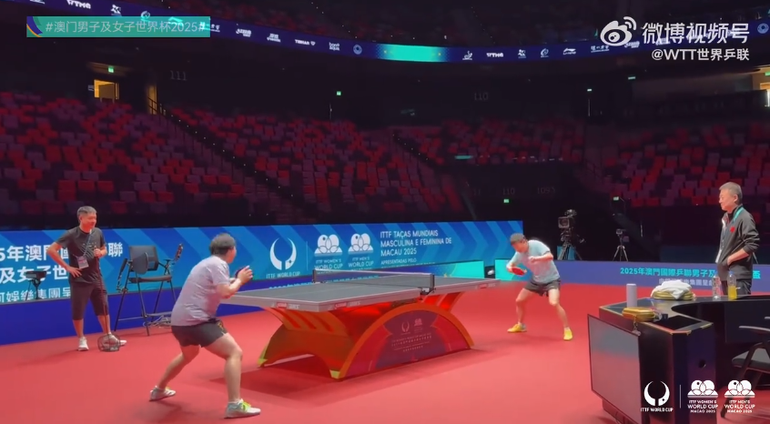 4月12日,WTT世界乒联发布国乒女队澳门世界杯适应场地训练画面,孙颖莎、王曼昱、蒯曼等参赛队员进行对练。