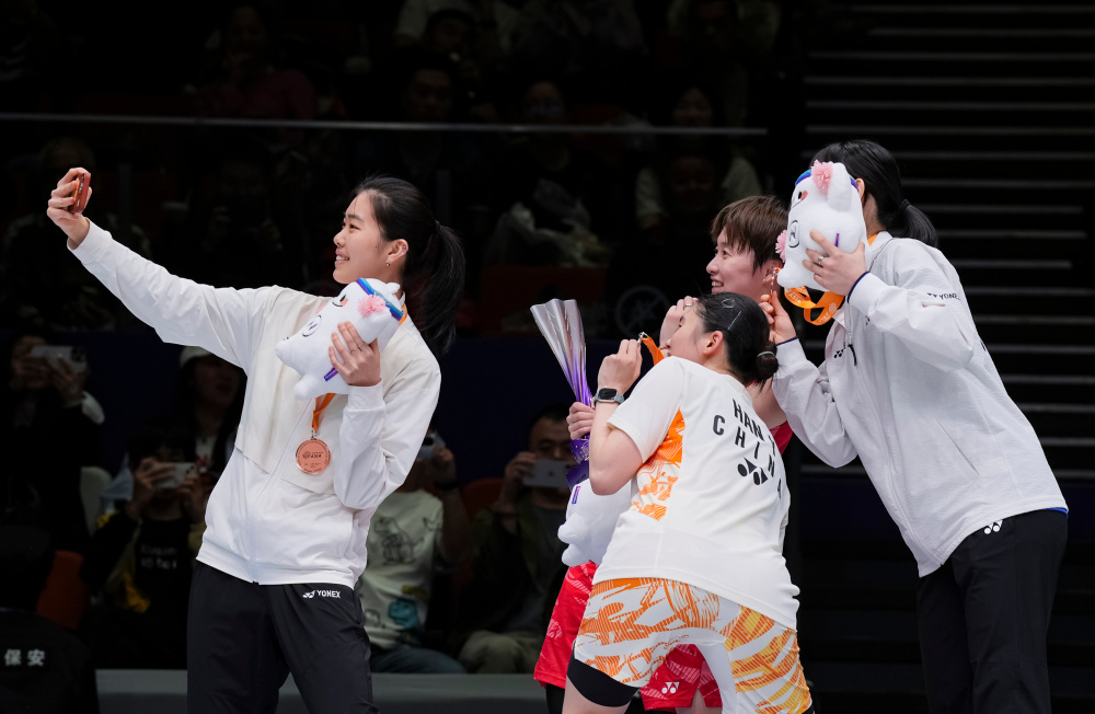 4月13日,冠军中国选手陈雨菲(右二),亚军中国选手韩悦(左二),季军中国选手高昉洁(左一)、韩国选手沈有振在颁奖仪式上合影。新华社记者 孙非 摄