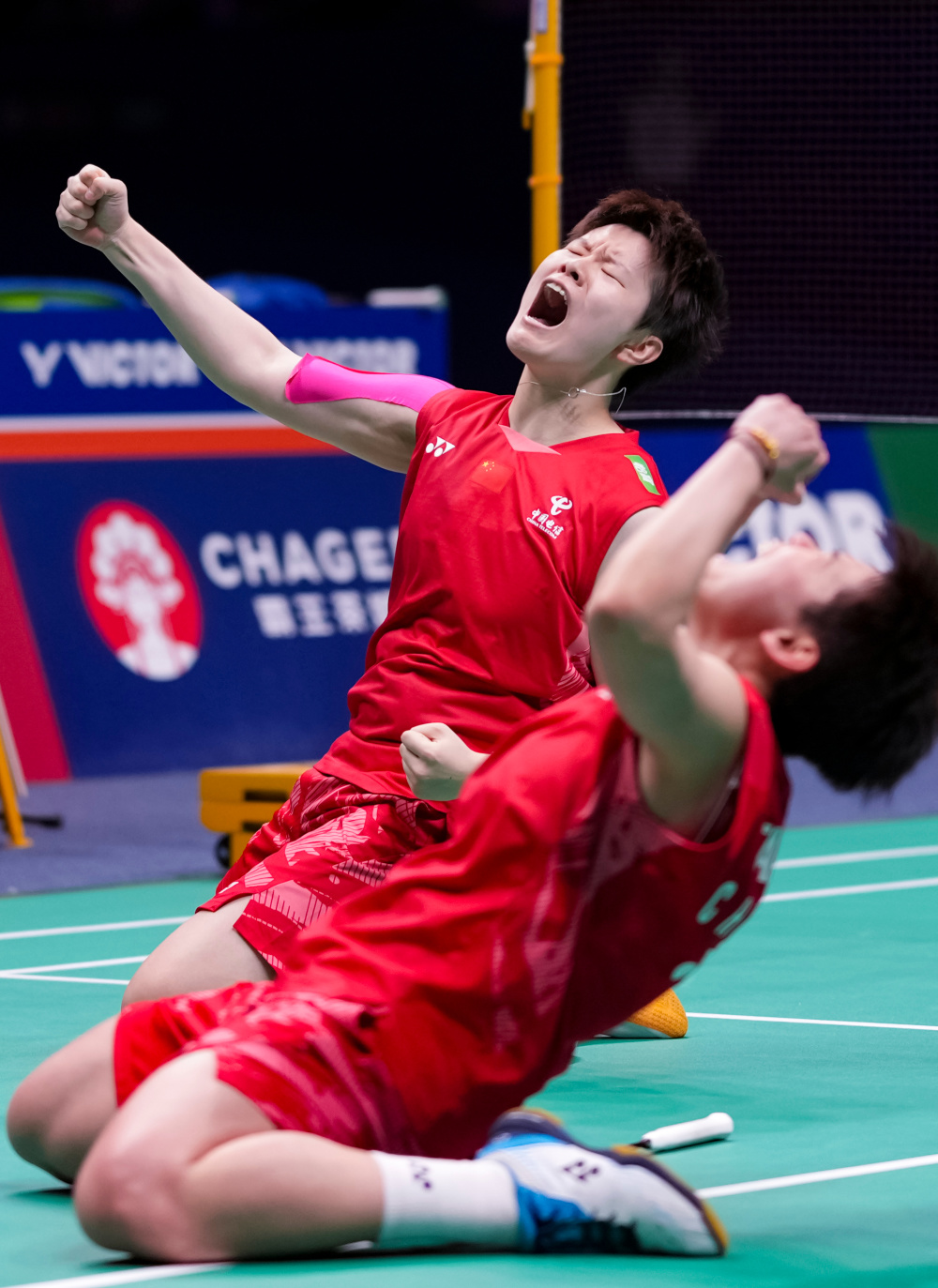 4月13日,刘圣书(左)/谭宁在比赛后庆祝。新华社记者 孙非 摄