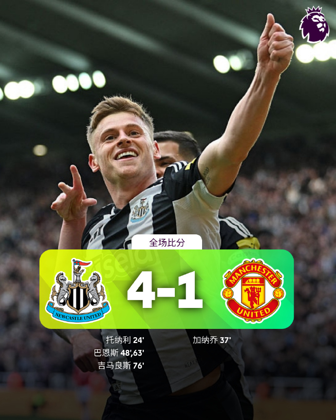 北京时间4月13日 23:30,英超第32轮纽卡斯尔联vs曼联,比赛在圣詹姆斯公园球场打响!上半场,托纳利抽射帮助纽卡打破僵局!达洛特助攻加纳乔,后者冷静推射破门扳平比分!下半场,哈维-巴恩斯帮助纽卡再次领先;齐尔克泽伤退;马兹拉维滑倒,哈维-巴恩斯一条龙完成双响!巴因德尔出球送礼,吉马良斯单刀破门。最终,曼联1-4不敌纽卡,积分榜排名跌至第14名,纽卡升至第4。