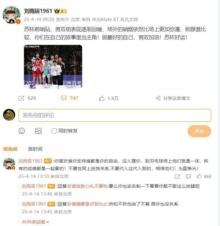 这应该是作为国羽男双老大哥的刘雨辰对刚刚参加完宁波亚锦赛的中国男双梁伟铿/王昶、刘毅/陈柏阳两对组合的鼓励,却没有想到遇到了一些球迷(粉丝)不理智的拉踩评论,以致他忍不住回复说——“到羽毛球场上他们就是一体,所有的成绩都是一起拿的!不要在网上挑拨关系,不要代入这代入那的,相信他们!为国争光!”