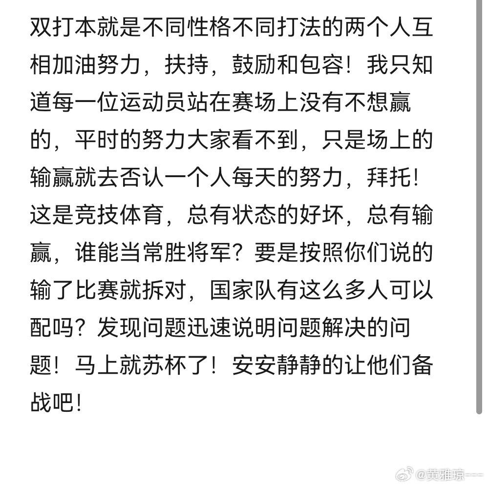 在评论区,巴黎奥运会混双冠军黄雅琼跟帖说:“双打本来就是不同性格不同打法两个人互相加油努力、扶持、鼓励和包容。”她表示,每一位运动员站在赛场上没有不想赢的,不应该用场上的输赢去否定运动员每天的努力,竞技体育总有输赢,谁能当常胜将军?