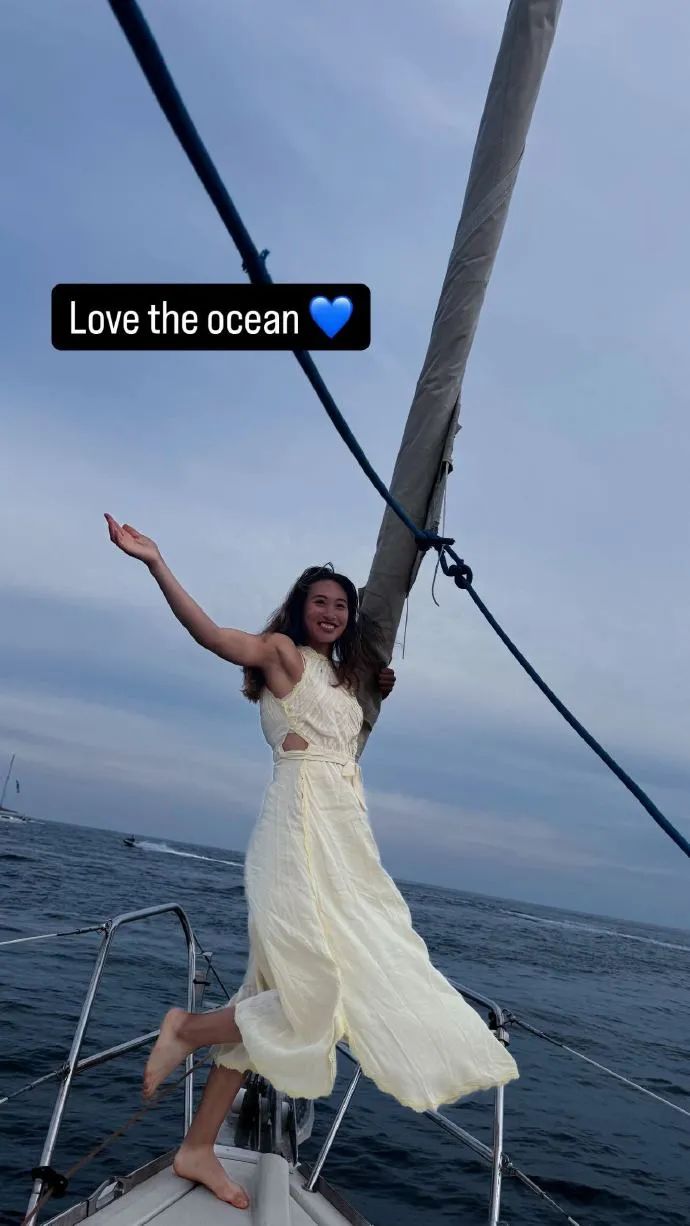 4月15日,郑钦文更新社媒晒出出海plog:love the ocean~