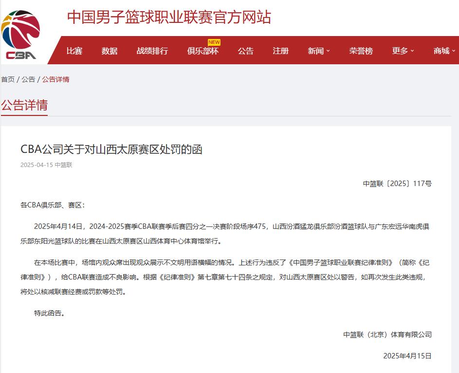 公告称,在本场比赛中,场馆内观众席出现观众展示不文明用语横幅的情况。上述行为违反了《中国男子篮球职业联赛纪律准则》(简称《纪律准则》),给CBA联赛造成不良影响。根据《纪律准则》第七章第七十四条之规定,对山西太原赛区处以警告,如再次发生此类违规,将处以核减联赛经费或罚款等处罚。