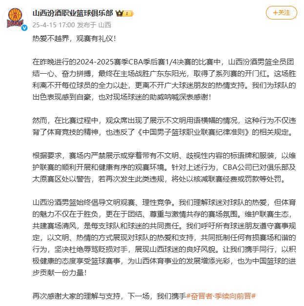 今天下午,山西男篮官方发布公告:在比赛过程中,观众席出现了展示不文明用语横幅的情况,这种行为不仅违背了体育竞技的精神,也违反了《中国男子篮球职业联赛纪律准则》的相关规定。根据要求,赛场内严禁展示或穿着带有不文明、歧视性内容的标语牌和服装,以维护联赛的顺利开展和健康有序的观赛环境。针对上述行为,CBA公司已对俱乐部及太原赛区处以警告,若再次发生此类违规,将处以核减联赛经费或罚款等处罚。