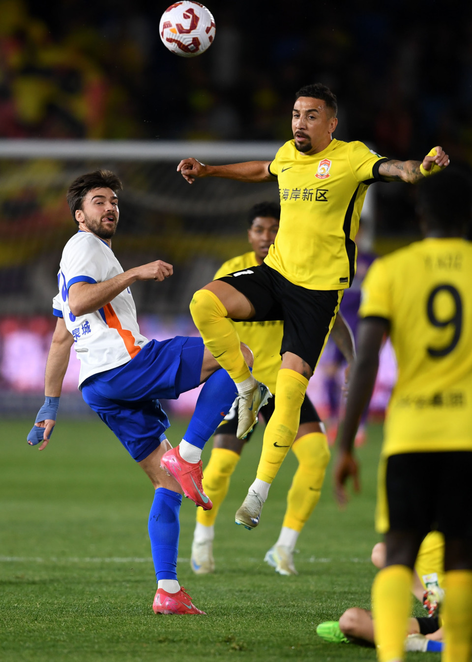 4月15日,山东泰山队球员泽卡(左一)在比赛中与青岛西海岸队球员徐彬(左二)争顶头球。新华社记者 李紫恒 摄