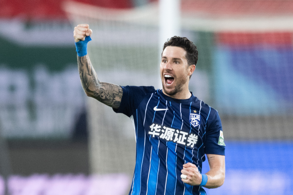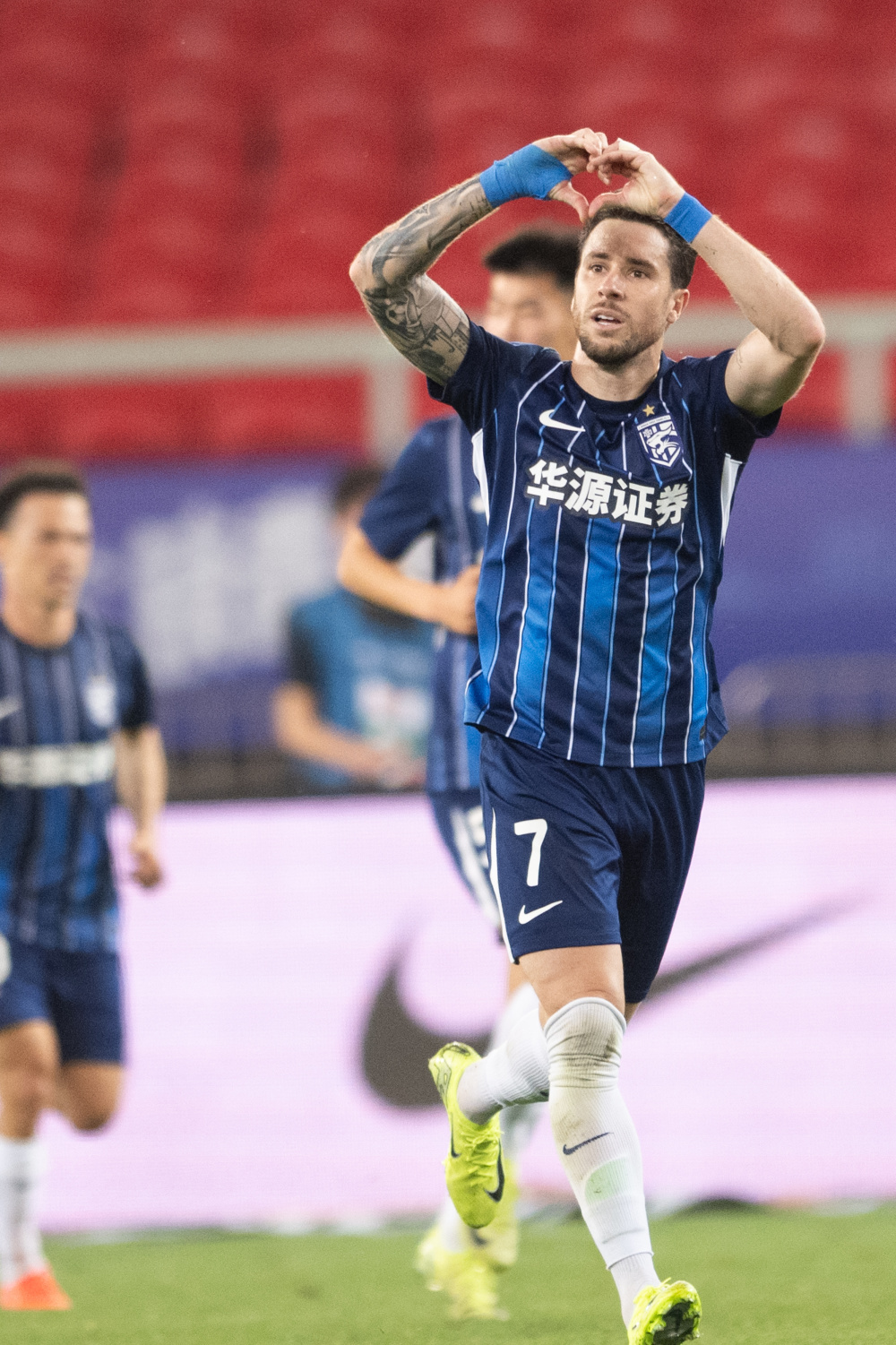 4月15日,武汉三镇队球员绍尔在罚进点球后庆祝。新华社记者 肖艺九 摄