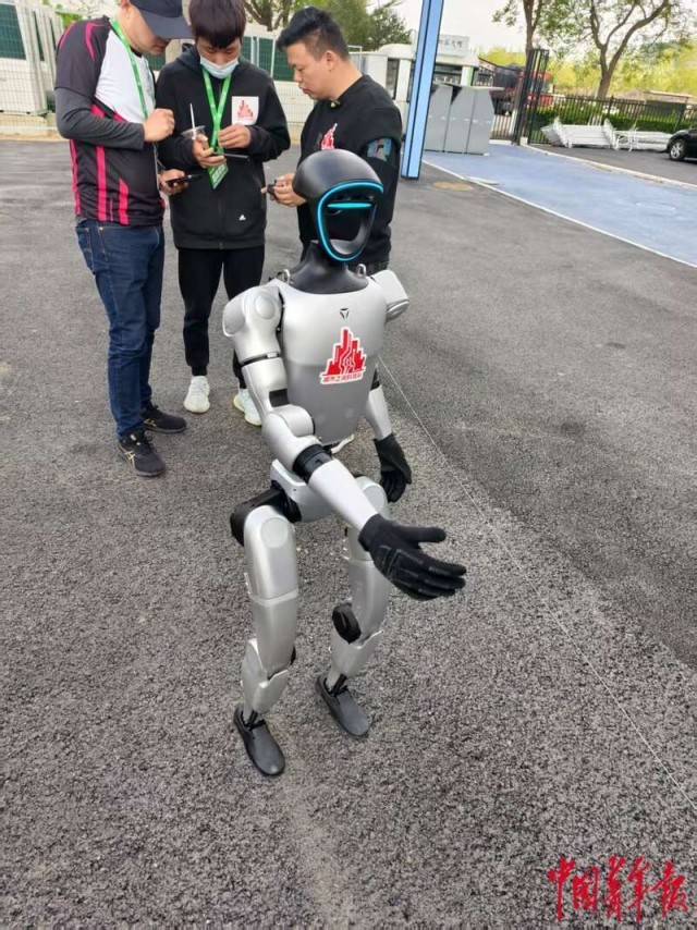 4月17日,北京亦庄人形机器人半程马拉松备赛场地,城市之间科技队参赛机器人为宇树G1。中青报·中青网记者尹希宁/摄