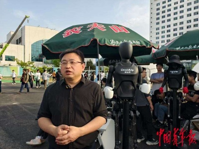 4月17日,北京亦庄人形机器人半程马拉松备赛场地,行者二号赛队总负责人李清都身后站立着参赛机器人。中青报·中青网记者尹希宁/摄