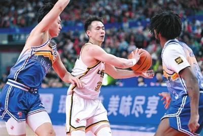 4月18日,辽宁男篮101比79战胜新疆男篮,总比分3比0晋级半决赛。图为辽宁男篮球员赵继伟(中)在比赛中突破。新华社发