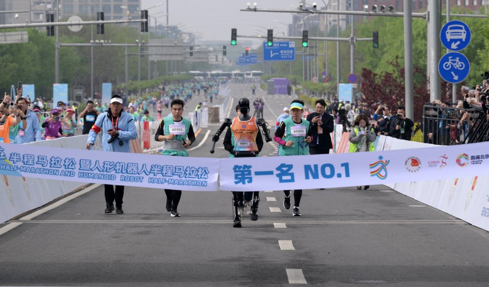 4月19日,“天工队”人形机器人在2025北京亦庄半程马拉松暨人形机器人半程马拉松比赛中冲向终点。新华社记者李贺 摄