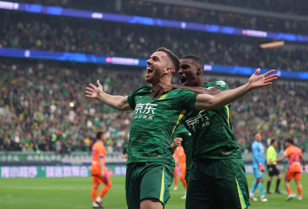 4月19日,在北京工人体育场举行的2025赛季中国足球超级联赛比赛中,北京国安队球员塞尔吉尼奥(左)在比赛中进球后和队友法比奥庆祝。新华社记者胡星宇 摄