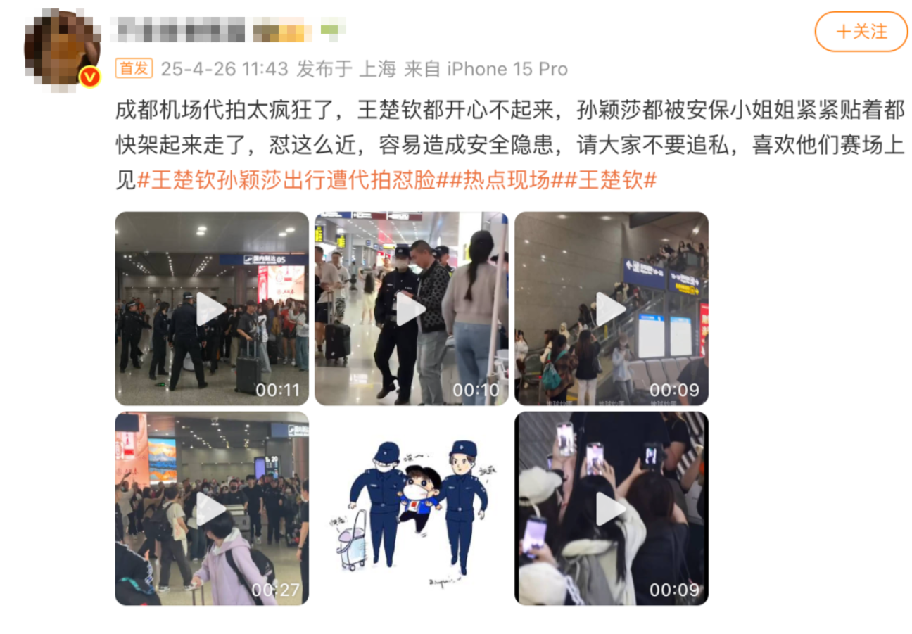 4月25日,王楚钦与孙颖莎抵达成都参加封训,被代拍者疯狂围堵拍照,多个球迷目睹王楚钦中途还被堵进了洗手间。