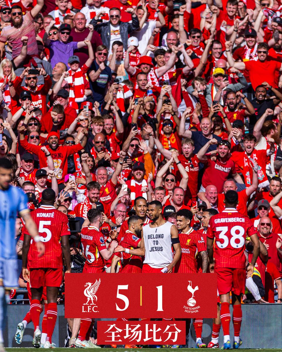 北京时间4月28日晚,2024-2025赛季英超第34轮的一场重头戏在安菲尔德球场开打,领头羊利物浦主场迎战热刺。此役利物浦旧将索兰克先拔头筹,随后迪亚斯、麦卡利斯特、加克波和萨拉赫各建一功,乌多吉自摆乌龙,利物浦5-1逆转热刺,提前4轮夺冠。