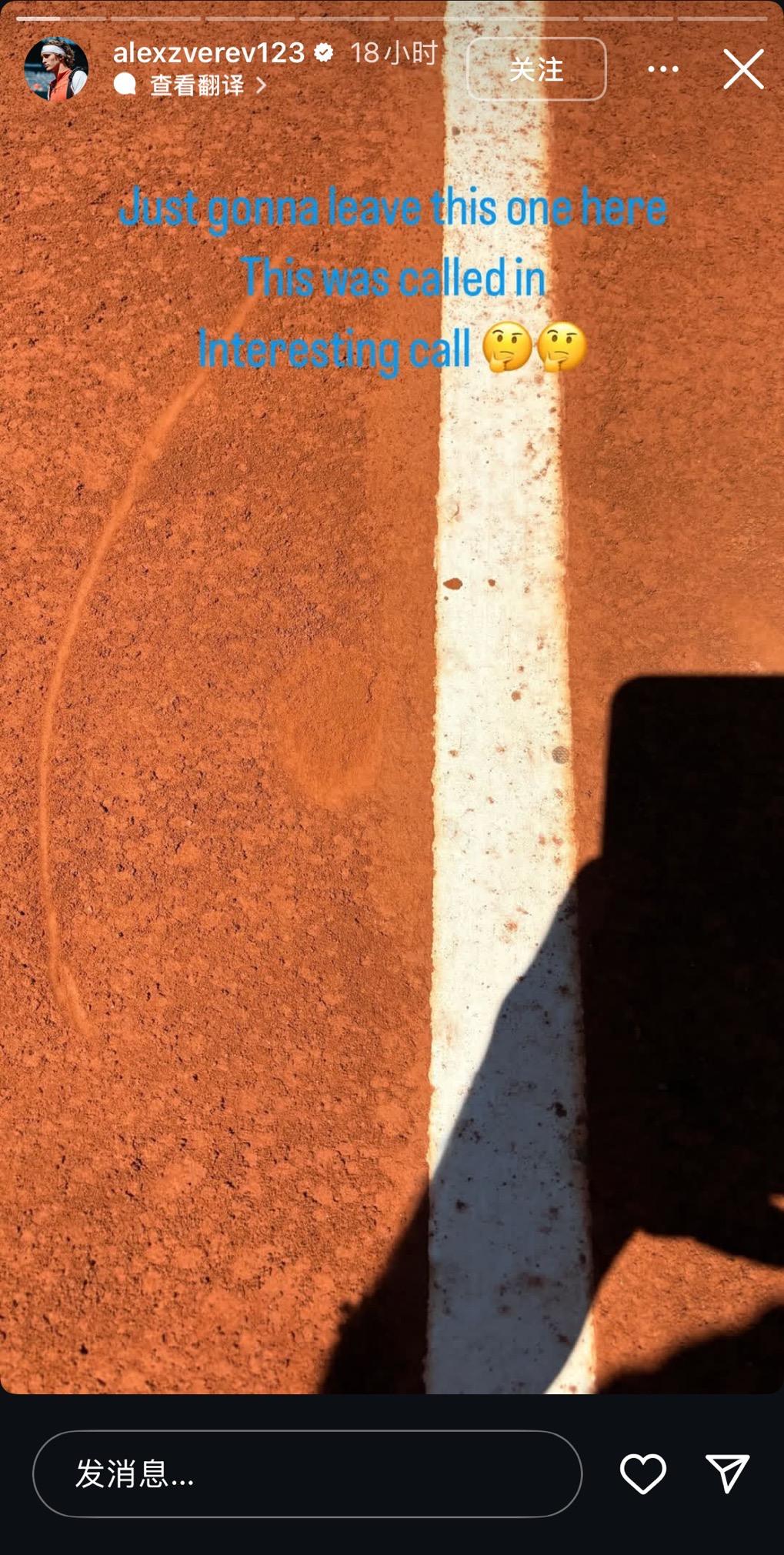 赛后,兹维列夫晒出了这张照片,根据球印来看,这确实是一个出界球。