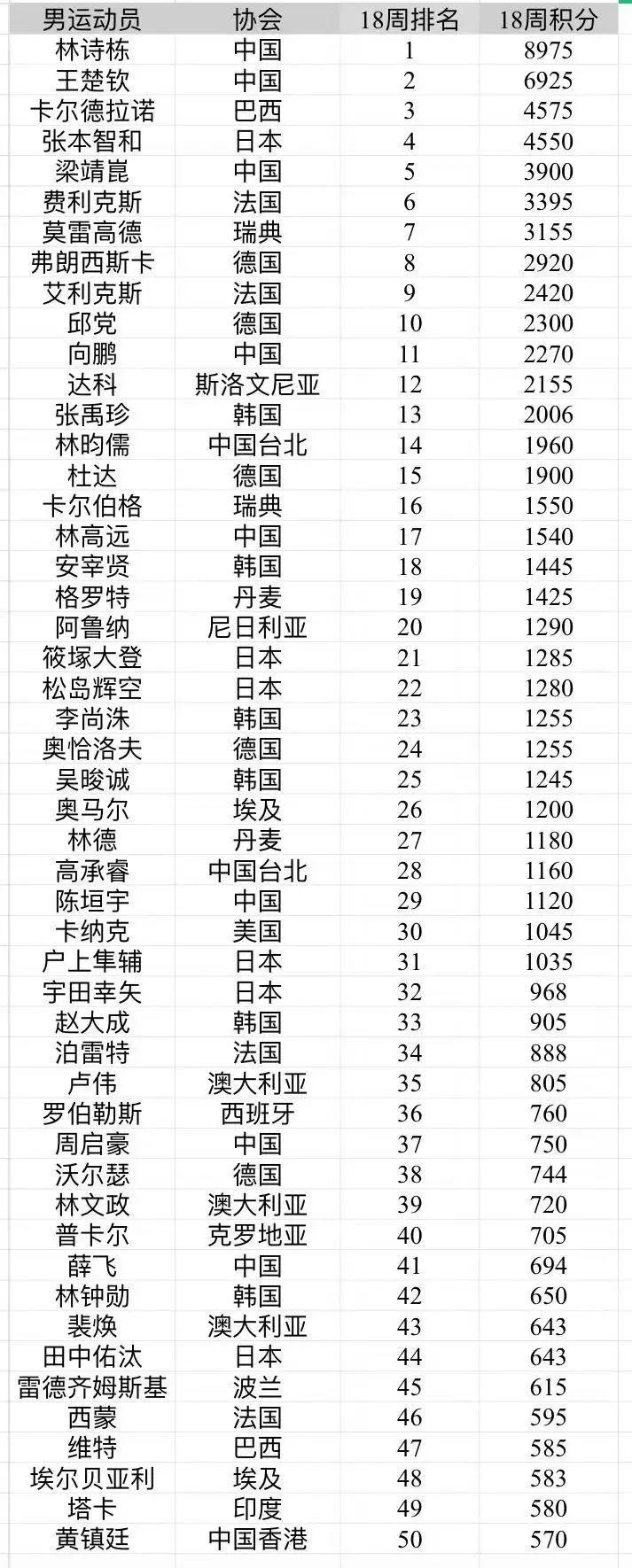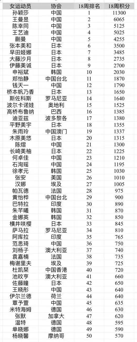4月29日,国际乒联公布了2025年第18周世界排名情况。