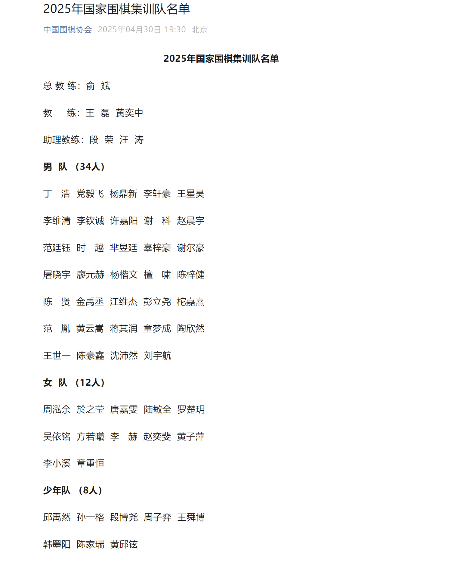 4月30日,中国围棋协会在官网公布了2025年国家围棋集训队名单,其中包括34名男棋手、12名女棋手和8位青少年棋手。中国围棋八冠王柯洁并未出现在名单之中。