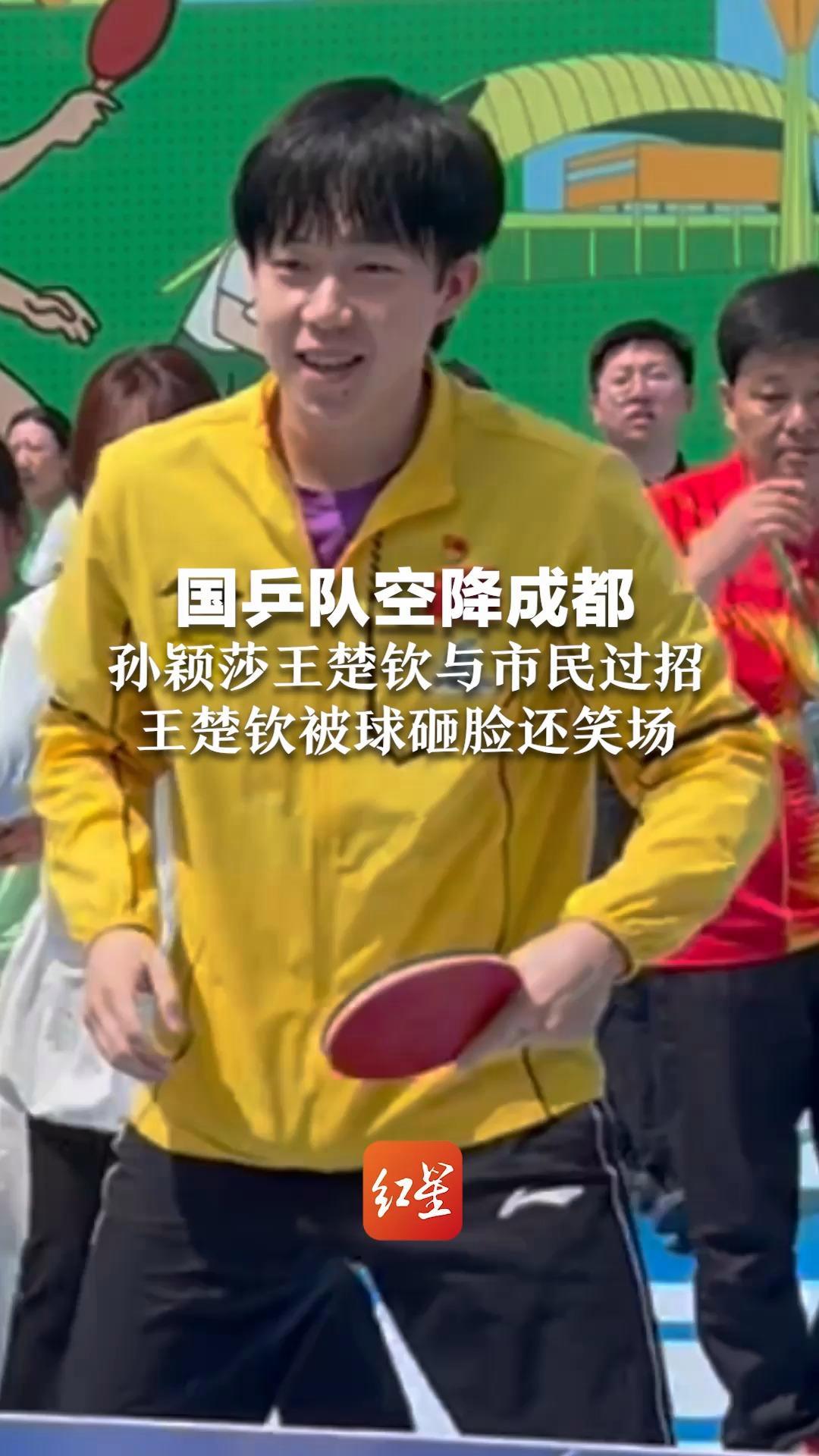 国乒五一空降成都,孙颖莎王楚钦与市民过招,王楚钦被球砸脸还笑场