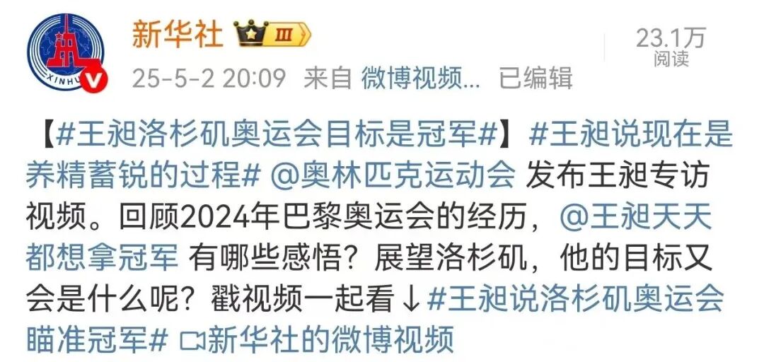 5月2日@奥林匹克运动会 发布王昶访问视频。回顾2024年巴黎奥运会的经历,王昶有哪些感悟?展望洛杉矶,他的目标又会是什么呢?戳视频一起看↓