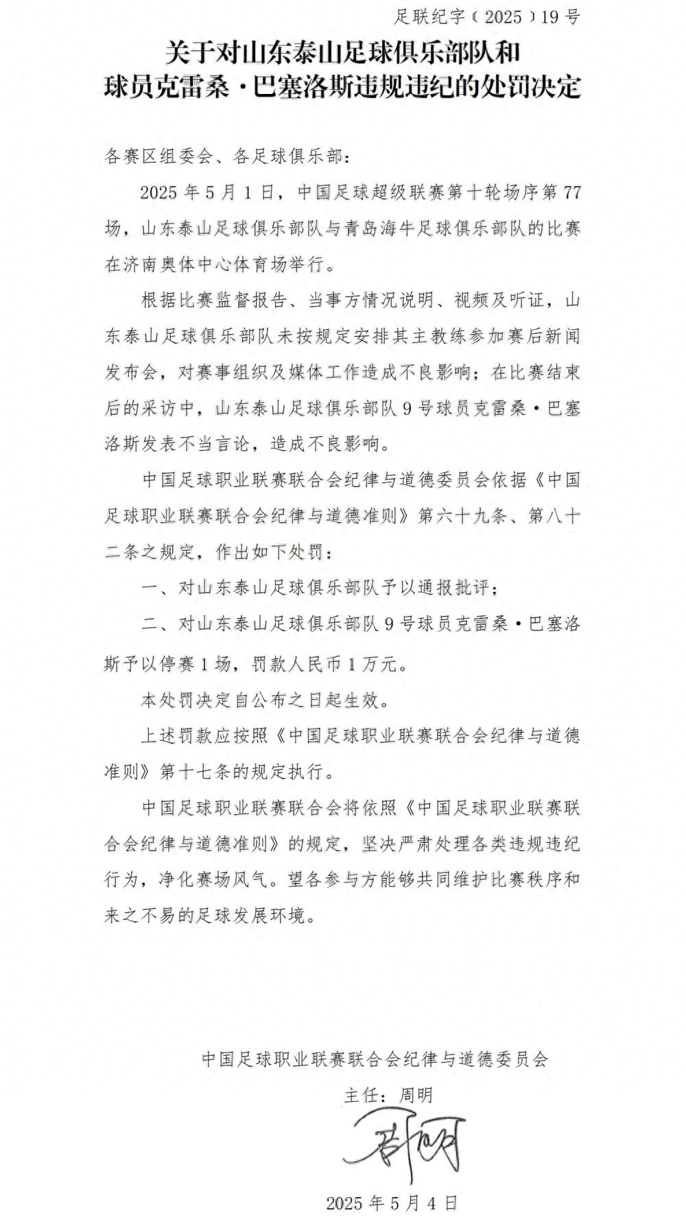 5月4日,中足联开出罚单:山东泰山队外援克雷桑因上一场对海牛比赛赛后发表不当言论,被停赛一场并罚款一万元人民币,这也意味着他将无缘5月5日晚客场对云南玉昆的比赛。